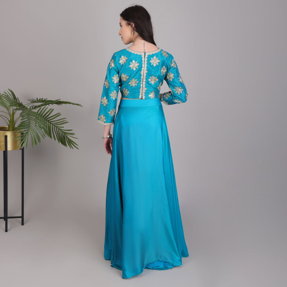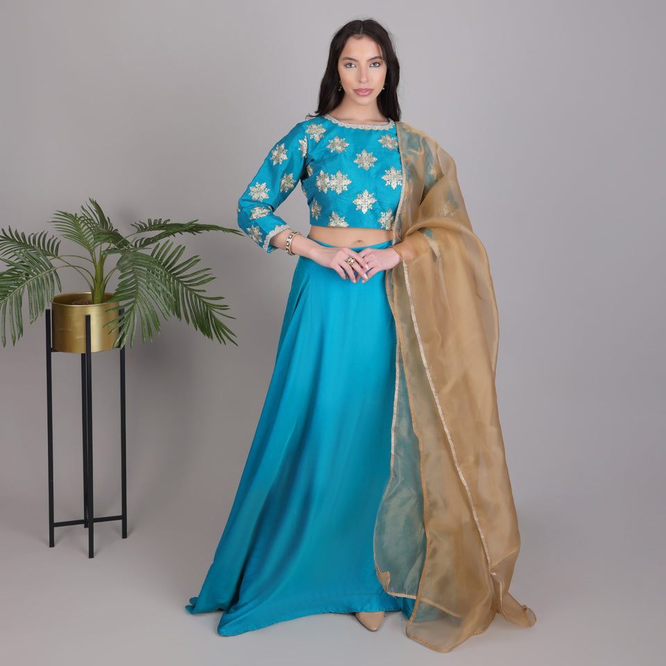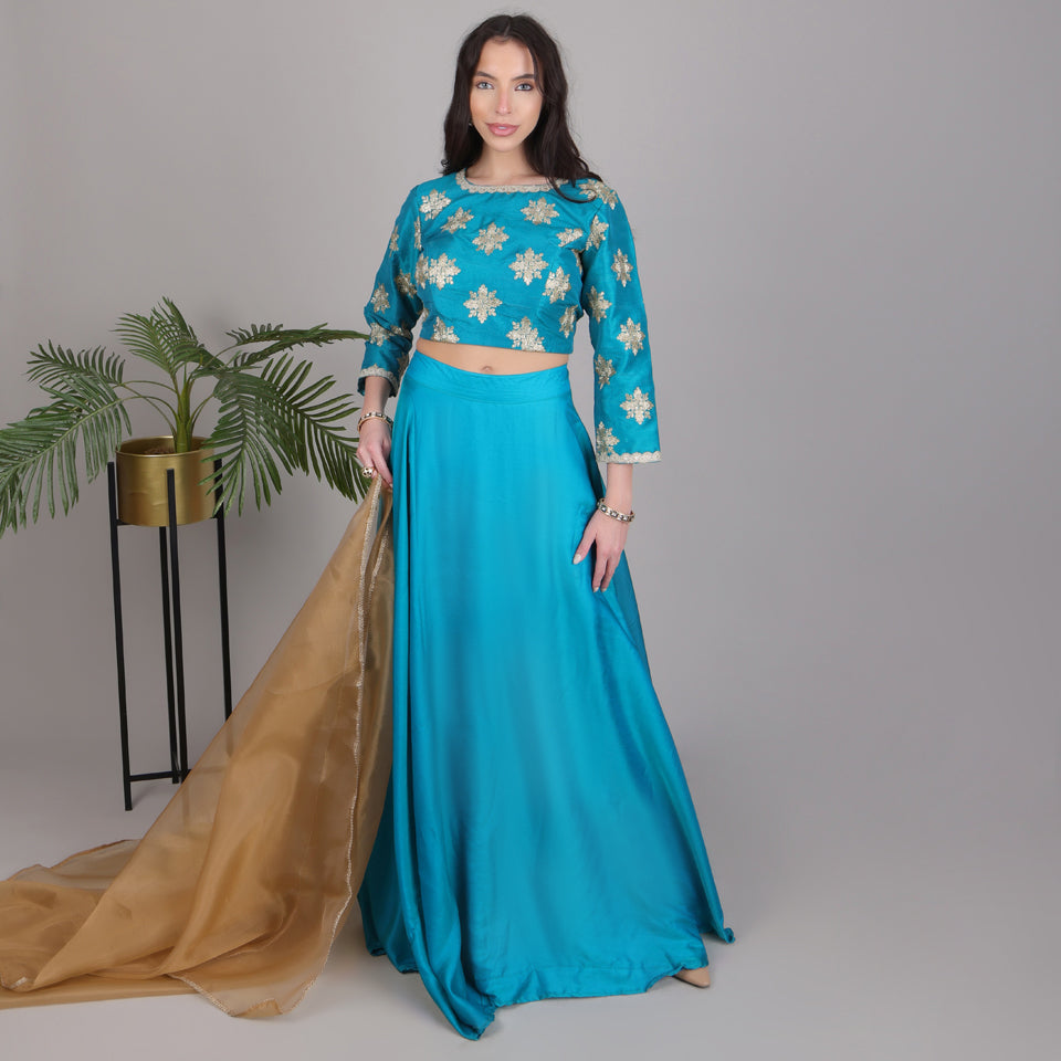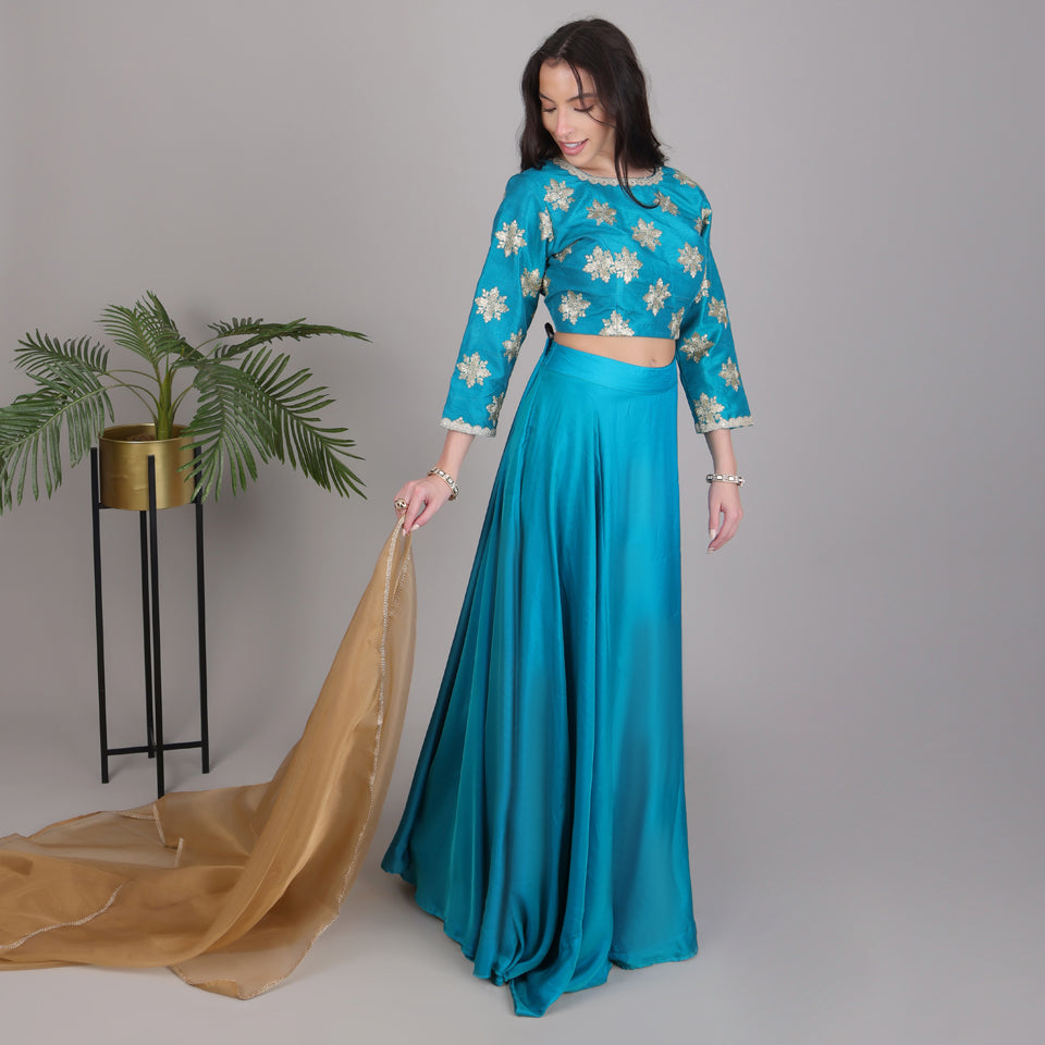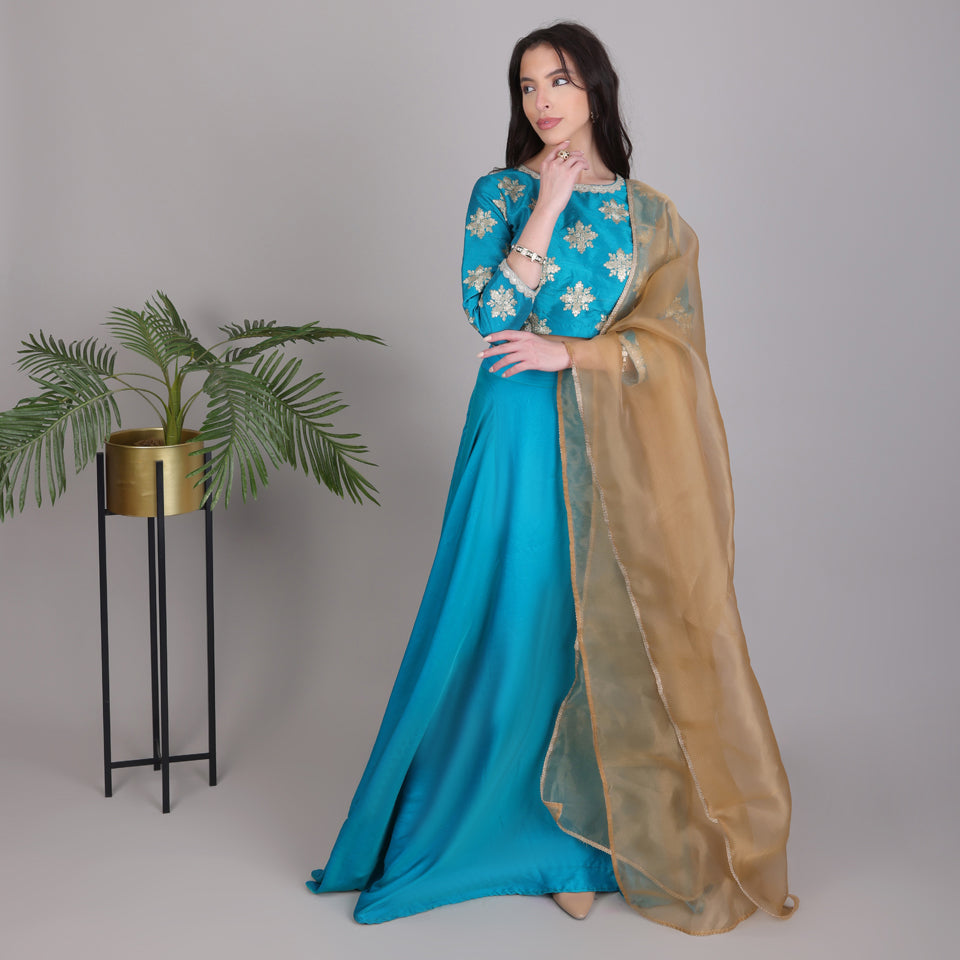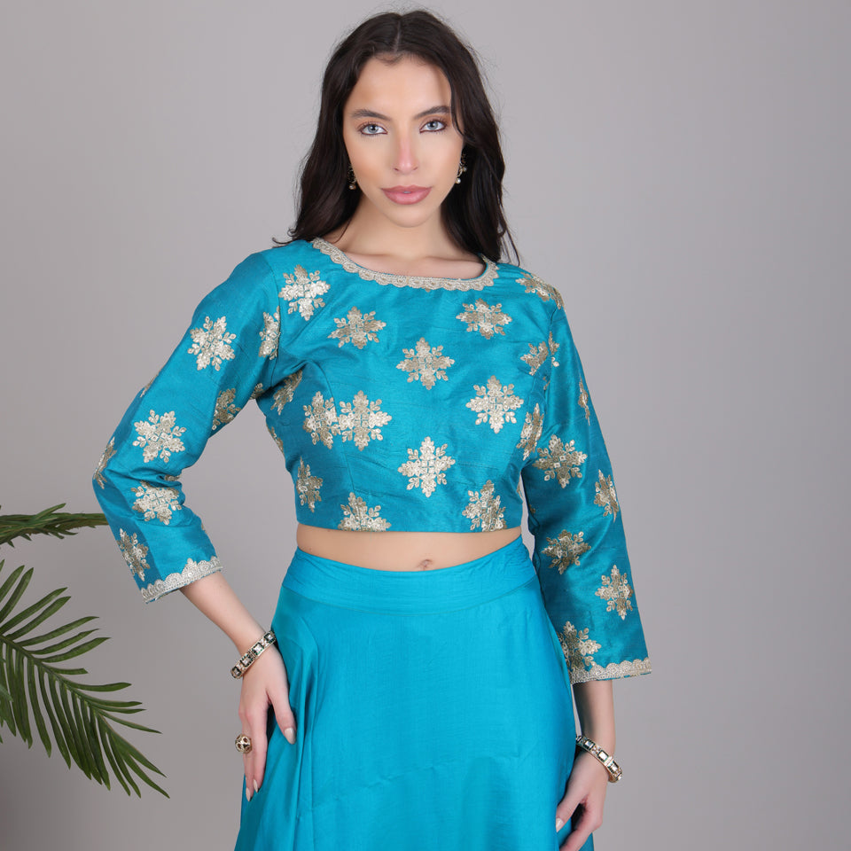 Woman wearing a blue traditional outfit with floral patterns, holding a gold fabric,