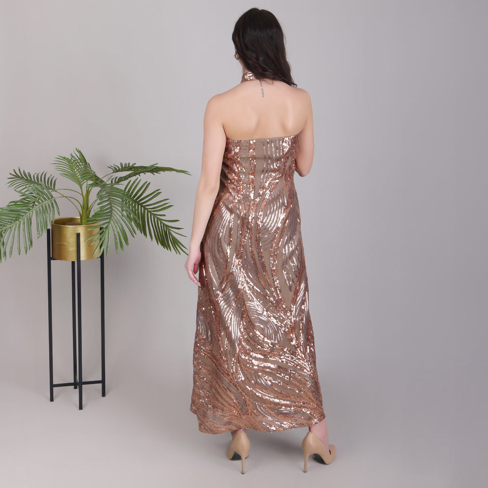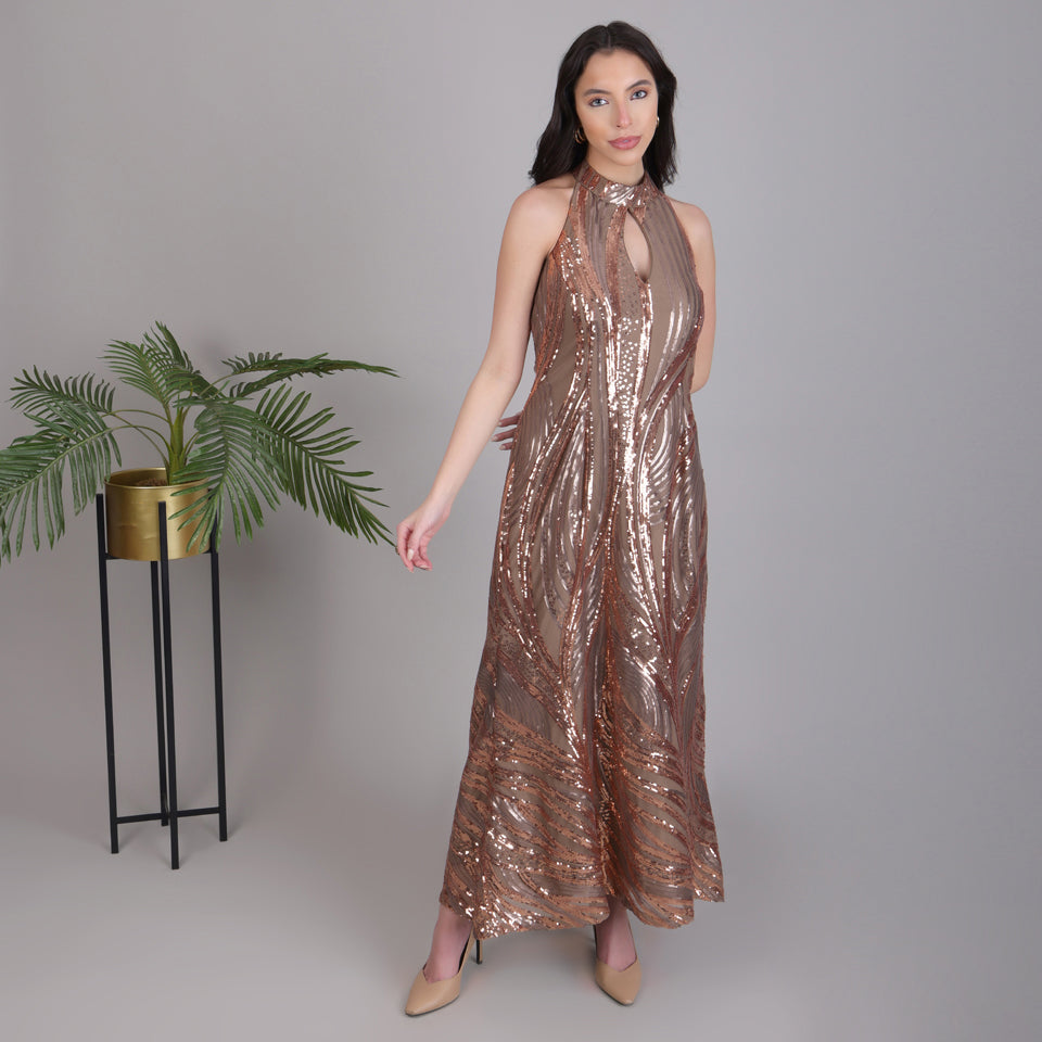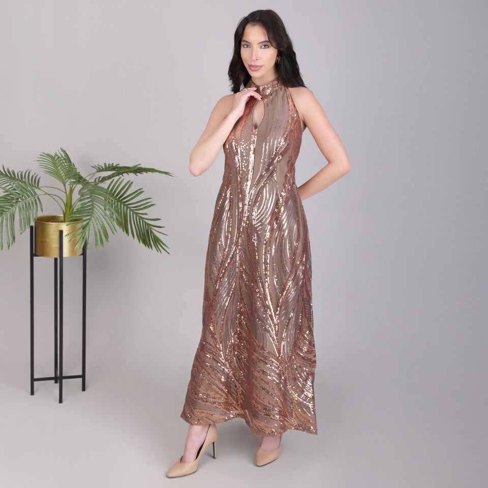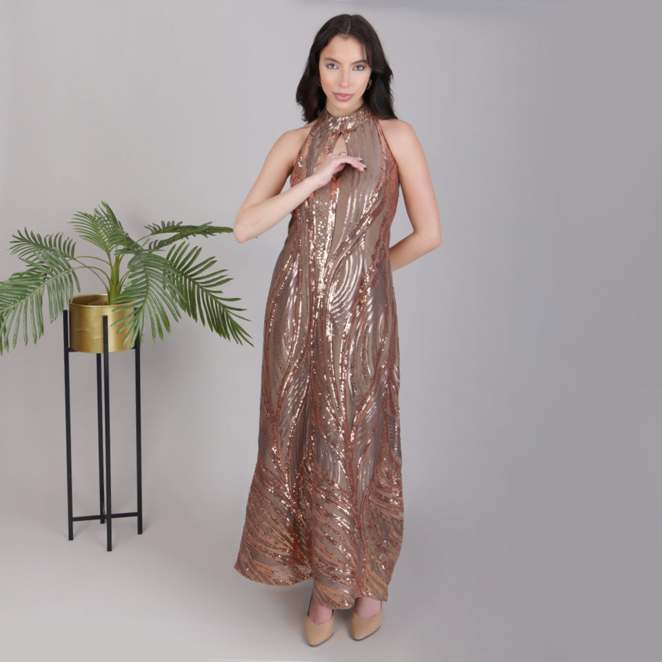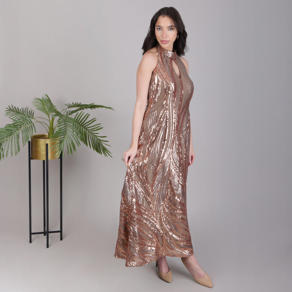 Woman wearing a bronze sequin dress against a plain background with a plant to the side.